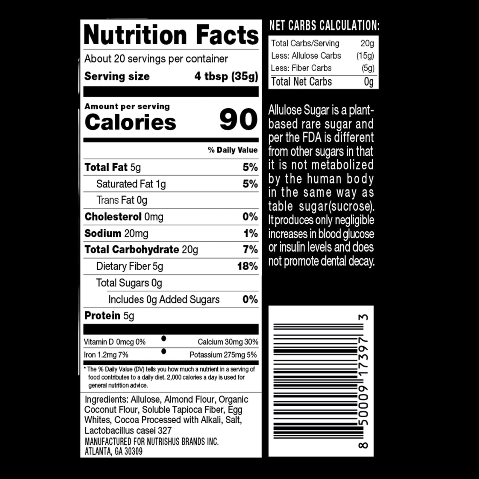 Ingredients: Allulose Sugar, Almond Flour, Organic Coconut Flour, Soluble Tapioca Fiber, Egg Whites, Cocoa Processed with Alkali, Salt